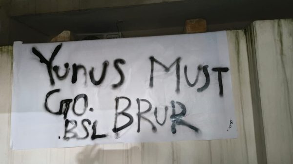 নিষিদ্ধ সংগঠন বাংলাদেশ ছাত্রলীগের সামাজিক যোগাযোগ মাধ্যম (ফেসবুক) এর একটি পোস্টে দাবি করা হয়েছে বেগম রোকেয়া বিশ্ববিদ্যালয় (বেরোবি), রংপুরে সংগঠনটির উদ্যোগে গতকাল “ইউনুস মাস্ট গো, বাঁচাও দেশ” শীর্ষক ক্যাম্পেইনের অংশ হিসেবে বিশ্ববিদ্যালয়ের বিভিন্ন দেয়ালে স্লোগান লেখা ও পোস্টার লাগানো হয়েছে। পোস্টে ‘#YunusMustGo’ হ্যাশট্যাগ ব্যবহার করে কয়েকটি ছবি প্রকাশ করা হয়, যেখানে পোস্টার তৈরির পাশাপাশি দেয়ালে ইংরেজি অক্ষরে স্লোগান লেখা দেখা যায়।