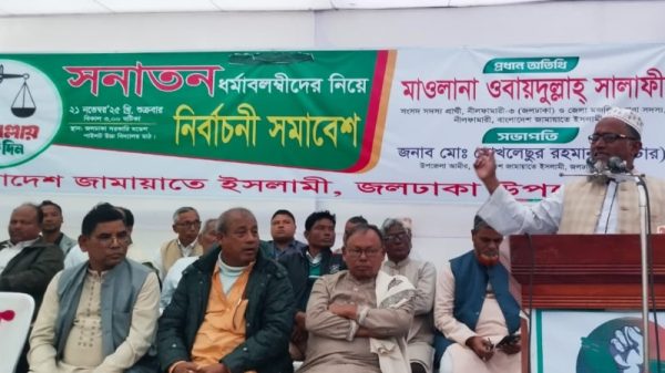 জহুরুল ইসলাম: আসন্ন জাতীয় সংসদ নির্বাচনকে সামনে রেখে নীলফামারীর জলঢাকা উপজেলায় রাজনৈতিক অঙ্গনে নতুন উদ্দীপনা সৃষ্টি হয়েছে। এরই ধারাবাহিকতায় হিন্দু ধর্মাবলম্বীদের স্বতঃস্ফূর্ত অংশগ্রহণে দাড়িপাল্লা পক্ষে নির্বাচনী সমাবেশ অনুষ্ঠিত হয়েছে। শুক্রবার