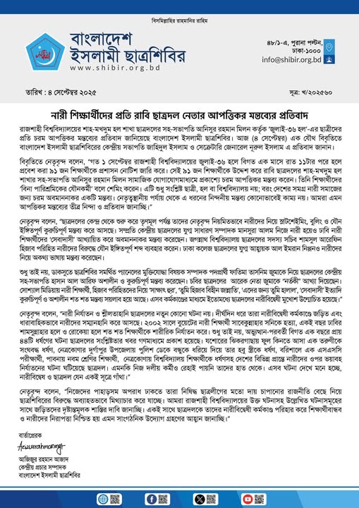 রাবি ছাত্রদল নেতার আপত্তিকর মন্তব্যের প্রতিবাদ শিবিরের